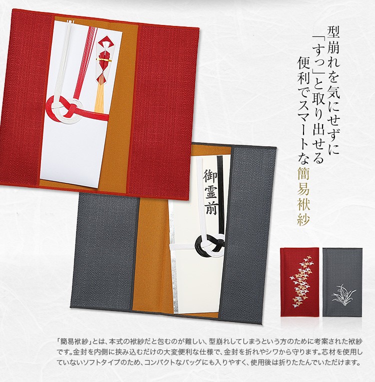 贈り物をする際、金封を袱紗に包んで差し出すのが礼儀ですが、それを簡便に使えるよう考案されたのが簡易袱紗です。一から包む手間がいらず、持ち運びの際に崩れたりすることもないのでとても便利です。
