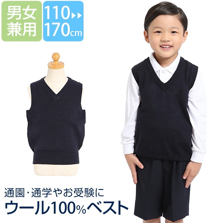 [スクールベスト 女の子 男の子 キッズ ウール100% 洗える ネイビー 紺 無地 スクール 制服 ベスト Vネック 110cm 120cm 130cm 140cm 150cm 160cm 170cm お受験 受験 面接 小学校 小学生 通園 通学]
