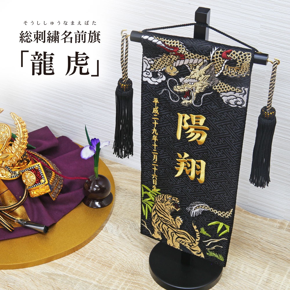 名前旗 名入れ旗 五月人形 刺繍 総刺繍名前旗 龍虎 木製スタンドセット