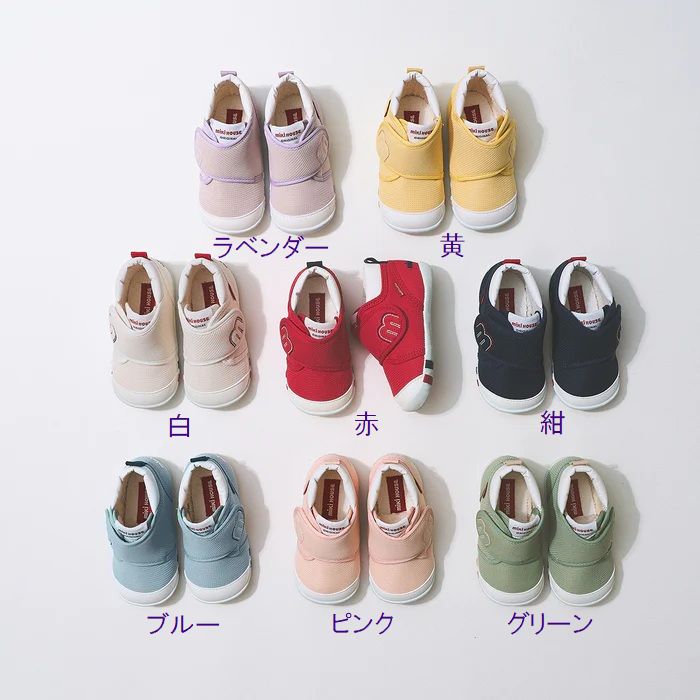 よちよち歩きのお子さまの歩行をサポートするファーストシューズ。8色のカラーバリエーションをご用意しております。
