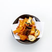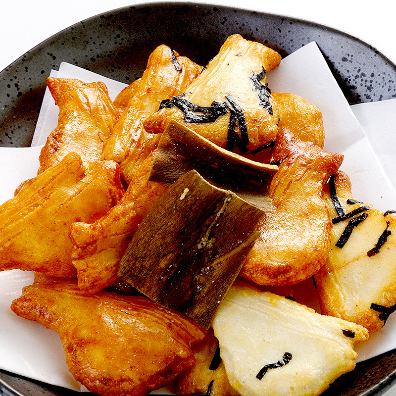 お腹はふっくら、背中の部分にヒビを入れユーモラスなふぐの姿を表現しました。薄味の白醤油のもの・海苔のついたもの、2種のふぐが楽しめるロングセラー商品です。
