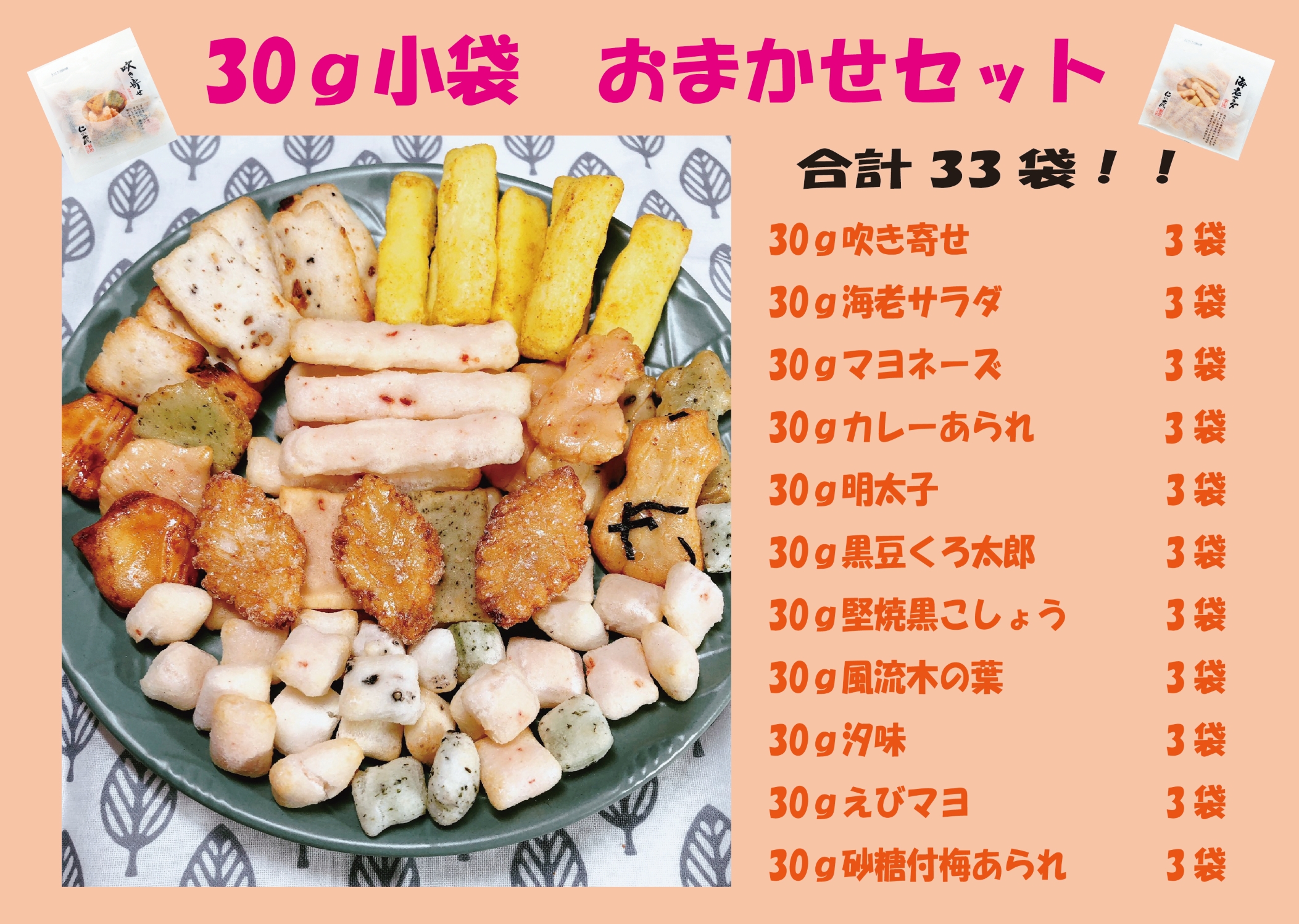 | 原材料名 | 【吹き寄せ】:もち米(国内産)、澱粉、醤油、植物油、えび、水飴、昆布、マヨネーズ、食塩、砂糖、黒大豆、玄米(国内産)、海苔、ごま、干魚、マヨネーズ風味粉末調味料、わかめ、アオサ、魚肉、ホタテ貝エキス、かつおエキス、青海苔、七味唐辛子、かにシーズニング、蛋白加水分解物、粉末緑茶、デキストリン、カレー粉、梅酢エキス、乾燥梅干、蜂蜜、香辛料、澱粉糖化物、みりん、肉エキス、野菜エキス、乳糖、昆布エキス、酵母エキス、生姜/甘味料(トレハロース、ステビア)、調味料(アミノ酸等)、着色料(紅麹、パプリカ色素、ベニバナ黄、クチナシ、ビートレッド、アナトー)、香料、膨張剤(ミョウバン)、香辛料抽出物、増粘剤(加工澱粉)、(一部にえび・かに・ごま・大豆・卵・小麦・鶏肉・乳成分・さば・りんご・ゼラチンを含む) 【海老サラダ】もち米(国内産)、植物油、食塩、ホタテ貝エキス、えび、粉末昆布/調味料(アミノ酸等)、着色料(紅麹、パプリカ色素) 【汐味】もち米(国内産)、食塩、ごま、えび、アオサ、粉末昆布、青海苔/調味料(アミノ酸等)、着色料(クチナシ、ベニバナ黄、紅麹、パプリカ色素) 【砂糖付梅あられ】もち米(国内産)、砂糖、醤油、水飴、食塩、梅肉コース、ごま、アオサ、かつおエキス、えび、粉末昆布、青海苔/甘味料(トレハロース)、着色料(クチナシ、ベニバナ黄、紅麹、パプリカ色素、紫コーン)、香料、調味料(アミノ酸等)、(一部にごま・えび・大豆・小麦・乳成分を含む) 【明太子あられ】:もち米(国内産)、植物油、明太子シーズニング、食塩、えび、かつおエキス、陳皮、ごま、山椒、唐辛子、砂糖/調味料(アミノ酸等)、着色料(紅麹、パプリカ色素)、香料 【風流木の葉】もち米(国内産)、醤油、水飴、砂糖、ごま、海苔、かつおエキス、えび、七味唐辛子、青海苔/甘味料(トレハロース)、香料、調味料(アミノ酸等)、着色料(クチナシ、ベニバナ黄、紅麹、パプリカ色素、カラメル)、増粘剤(加工澱粉)、(一部にごま・えび・大豆・小麦を含む) 【マヨネーズ】もち米(国内産)、マヨネーズ、食塩、マヨネーズ風味粉末調味料、かつおエキス、粉末昆布、ごま、えび、アオサ、乾燥梅干、青海苔/調味料(アミノ酸等)、着色料(クチナシ、ベニバナ黄、紅麹、パプリカ色素)、酸味料、香料、(一部にごま・えび・卵・大豆・りんご・乳成分を含む) 【えびマヨ】もち米(国内産)、マヨネーズ、食塩、えび、七味唐辛子、粉末昆布/調味料(アミノ酸等)、着色料(紅麹、パプリカ色素)、(一部にえび・ごま・卵・りんご・大豆を含む) |