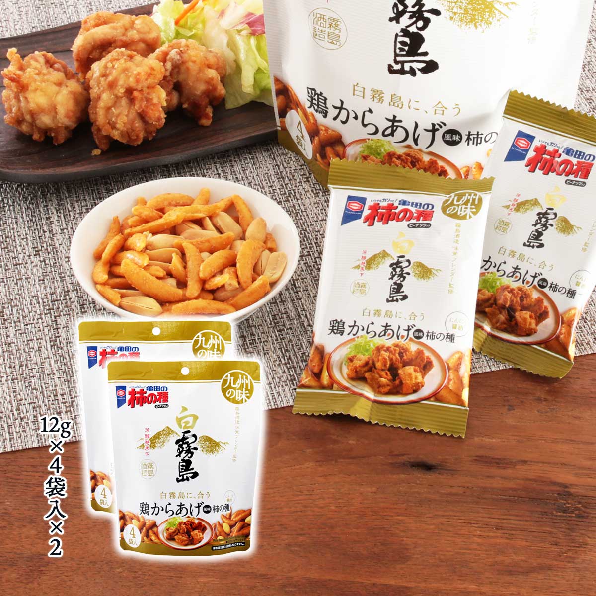 バランスが良く、飲みごたえのある本格焼酎「白霧島」には、九州の味「鶏からあげ」風味の柿の種。