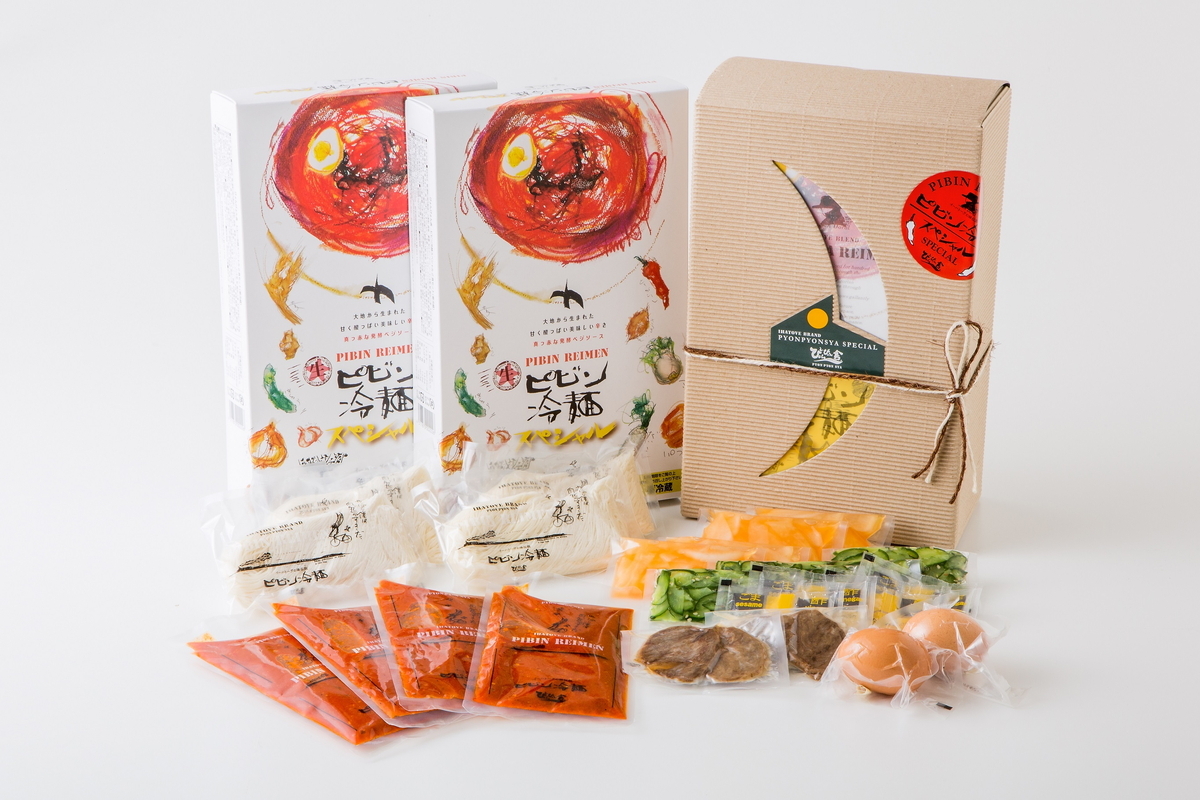 | 原材料 | 【麺】澱粉、小麦粉、食塩/重曹、加工デンプン、 【ソース】玉葱、梨、醤油、ごま油、鶏ガラ、砂糖、唐辛子、牛骨、きゅうり、酒、さつまいも、すりにんにく、生姜、パプリカ、ブラックペッパー、牛肉、長葱、豚骨、人参、豚肉、ごま、食塩、昆布、白菜、落花生/調味料(アミノ酸等)、カラメル色素 【大根漬け】大根、生姜、すりにんにく、食塩、砂糖、唐辛子/調味料(アミノ酸等) 【甘酢きゅうり】きゅうり、りんご酢、砂糖、ごま、食塩 【殻付ゆで卵】鶏卵 【牛味付肉】牛肉、醤油、酒、みりん、砂糖、生姜 【穀物酢】 【ごま】 |