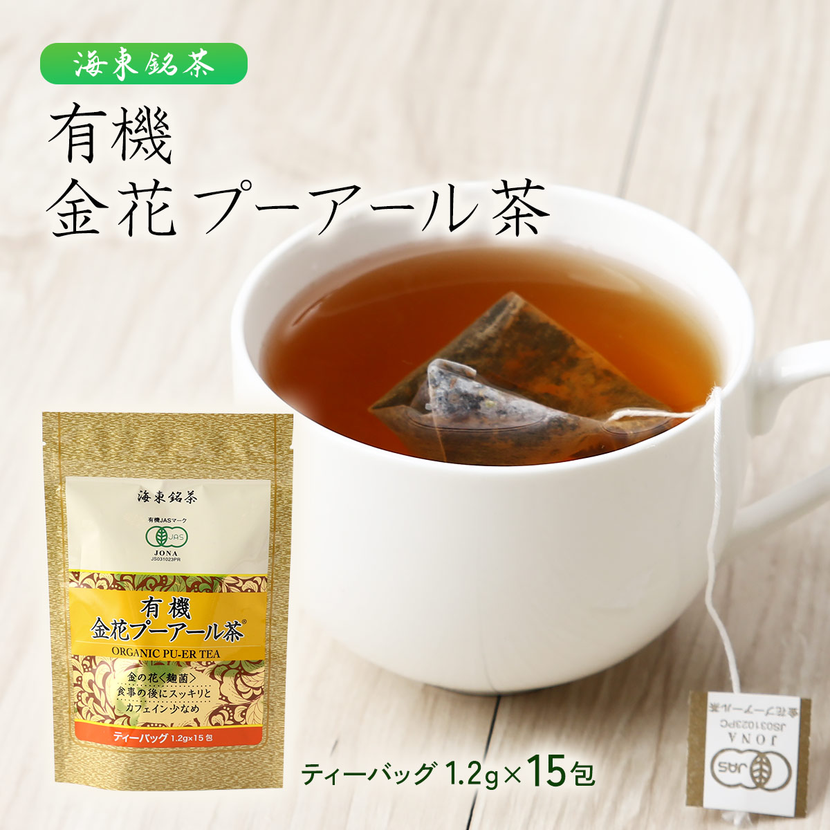 ティーバッグタイプの有機金花プーアール茶です。