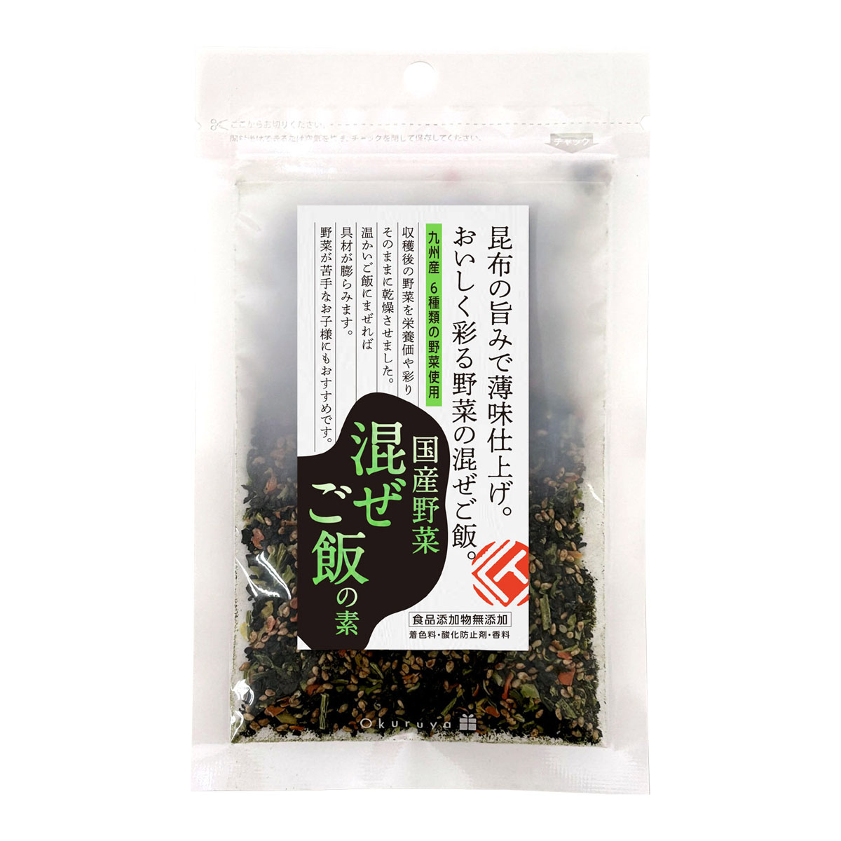 原材料:野菜チップ(野菜(大根葉、小松菜、高菜、キャベツ、ほうれん草、にんじん)(国産)、ブドウ糖)、いりごま、食塩、昆布粒、かつお節、砂糖、酵母エキス、しょうゆ(大豆・小麦を含む)