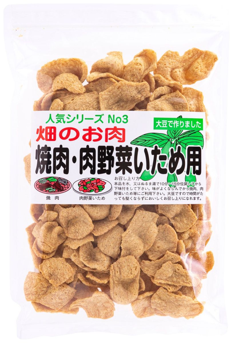 信州物産オリジナルの大豆ミート(ソイミート)「畑のお肉」は大豆を主原料に、まるで本物のお肉を食べているような食感に仕上げました。 大豆はコレステロールがゼロにもかかわらずイソフラボンやサポニンなどを多く含みます。 その栄養価はそのままに乾燥食品にしました。 ですから高たん白、低カロリーはそのままに日持ちがしますので、必要な時に必要なだけぬるま湯で戻して使うことができます。 お湯でもどしてお肉の代わりに肉野菜炒めなどにお使いください。 大豆の栄養はそのままにカロリーは普通のお肉の3分の1です!