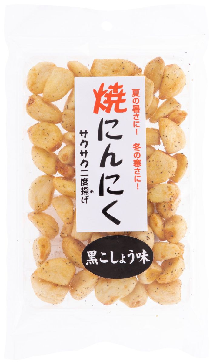 当店1番人気の焼にんにく菓子です!リピーター続出! 粒選りのにんにくを二度揚げしてサクサクのスナックに仕上げ、黒こしょうをまぶしました。 ビールのおつまみやお子様のおやつにもどうぞ! また砕いてラーメンのトッピングにお使い頂いてもGood! 一味変わること請け合いです!でも食べ過ぎにはご注意を!