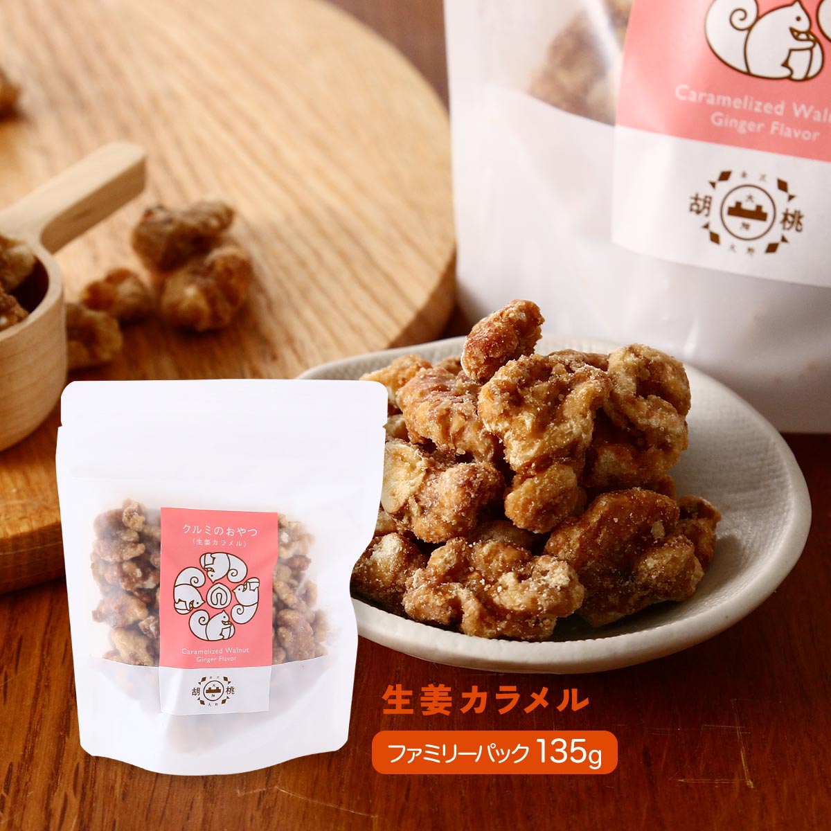 | 原材料 | ローストくるみ(くるみ(アメリカ産))、砂糖、おろししょうが(生姜、食塩)、食塩/カラメル色素 |
