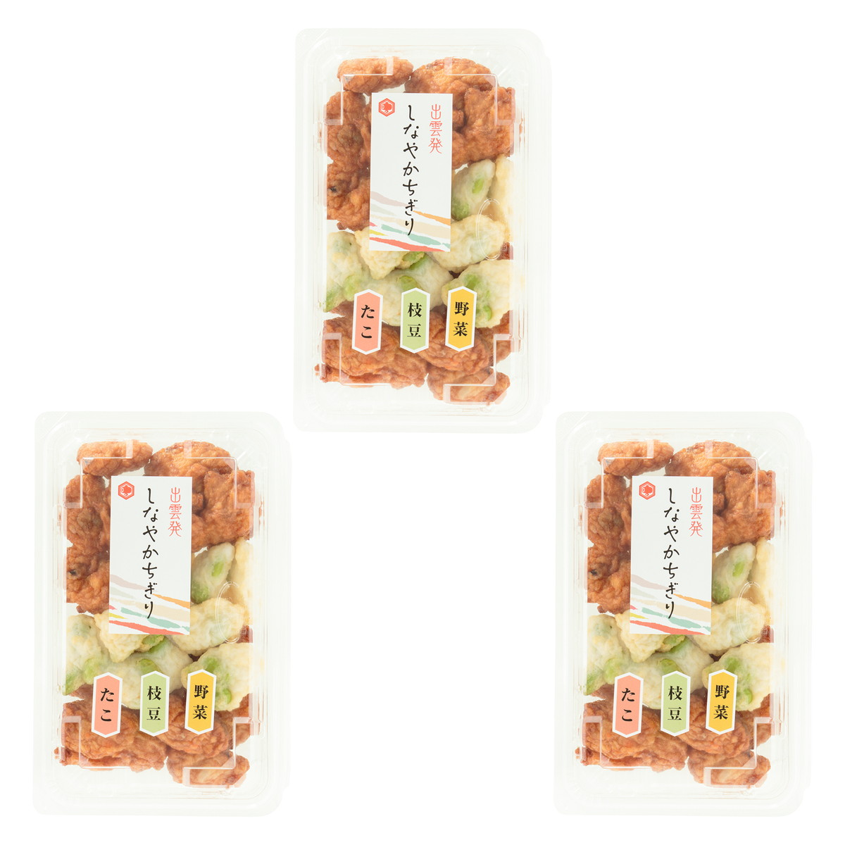 原材料名:魚肉、タコ、枝豆、たまねぎ、ごぼう、にんじん、澱粉、砂糖、食塩、植物性たん白、植物油、唐辛子/調味料(アミノ酸等)、(一部に小麦・大豆を含む)