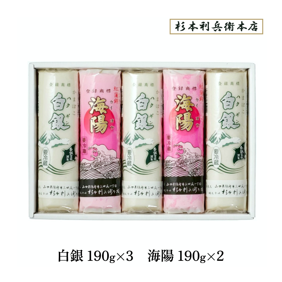 詰合せ 杉本利兵衛本店 ことぶき5本入 白銀190g×3、海陽190g×2 /ギフト 贈り物 詰合せ かまぼこ ちくわ 山口県 防府市 魚 練り物 白銀本舗 老舗 宮内庁御用 白銀 水産練製品 竹輪 蒲鉾 カマボコ セット商品 お祝い