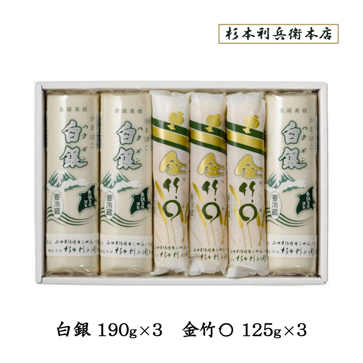 詰合せ 杉本利兵衛本店 白銀・金竹〇 6本入 白銀 190g×3、金竹〇125g×3 /ギフト 贈り物 詰合せ かまぼこ ちくわ 山口県 防府市 魚 練り物 白銀本舗 老舗 宮内庁御用 白銀 水産練製品 竹輪 蒲鉾 カマボコ セット商品 お祝い
