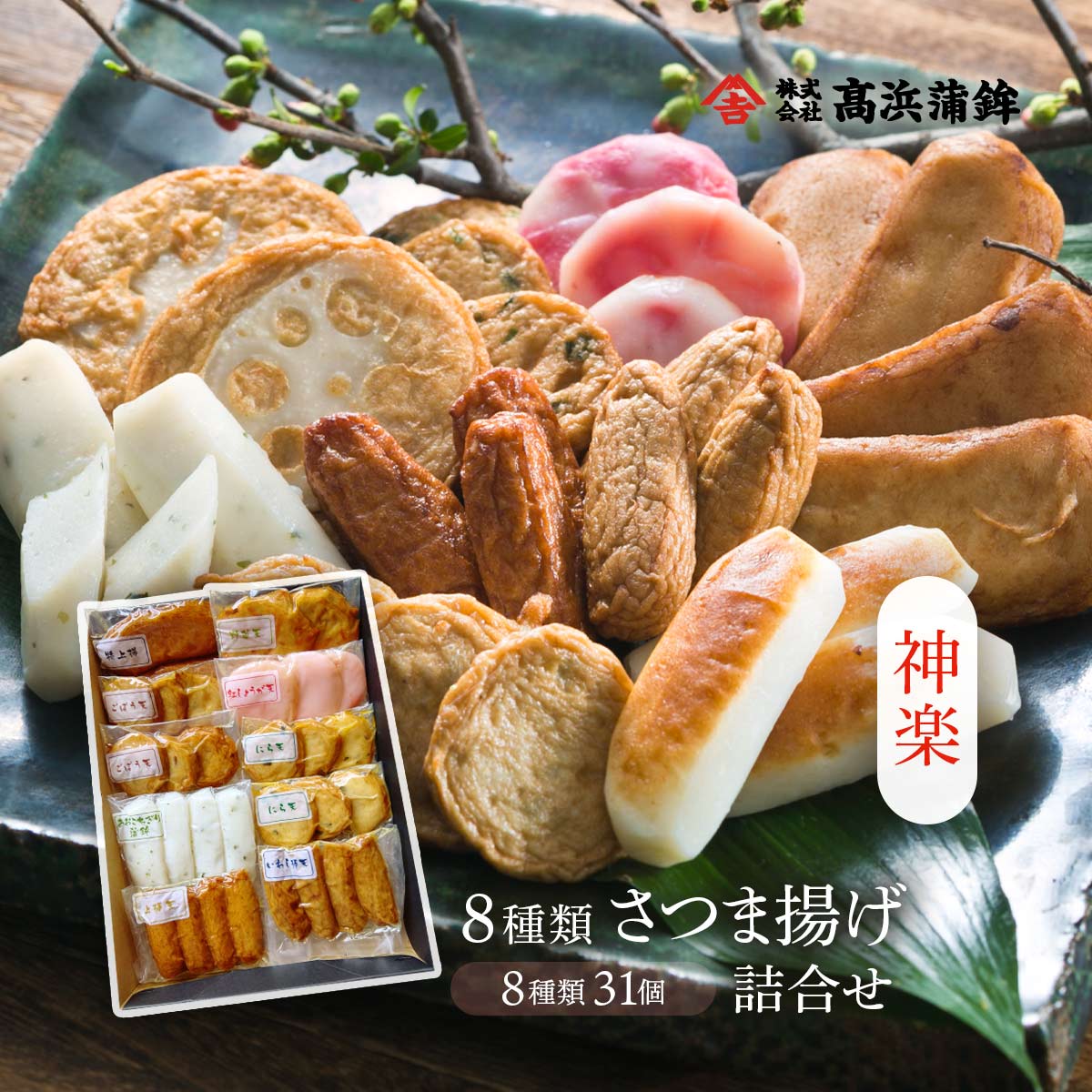 さつまあげ 高浜蒲鉾 真空 8種類 さつま揚げ 詰合せ 【神楽】 ごぼう天6枚、にら天6枚、あおさちぎり蒲鉾4枚、上棒天4枚、いわし棒天4枚、紅しょうが天3枚、特上揚2枚、野菜天2枚 8種31枚(真空) /ギフト 贈り物 鹿児島県 さつま揚げ おつまみ 酒の肴 詰合せ 便利 惣菜 つまみ おかず 老舗 蒲鉾 地酒 サツマアゲ 薩摩 鹿児島 魚介 お土産 酒の肴 そのまま 練り物 ふんわり 灰持酒 名物 鹿児島名物 薩摩名物