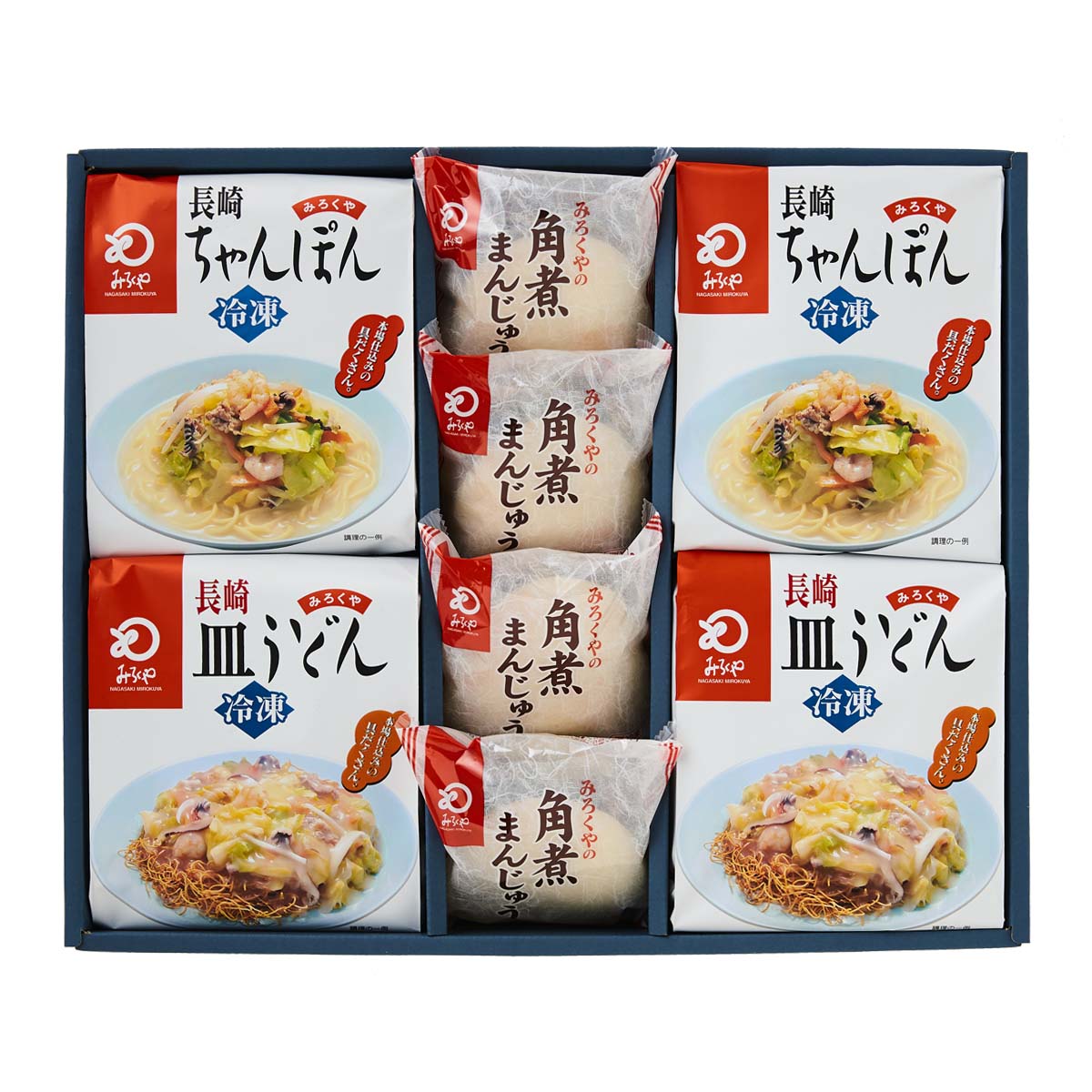 | 内容量 | 冷凍ちゃんぽん 350g(めん 140g、具材 175g、スープ 35g)、冷凍皿うどん 263g(具材 175g、めん 60g、スープ 28g) 各2人前、角煮まんじゅう×4 |