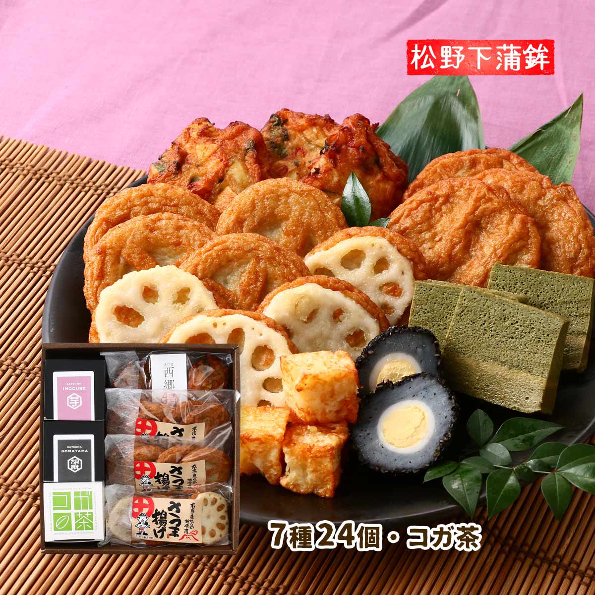 | 内容量 | 7種(ごぼう天4、西郷揚げ3、薩摩藩4、れんこん天4、ごまたま1個、芋キューブ8個、コガ茶70g) |