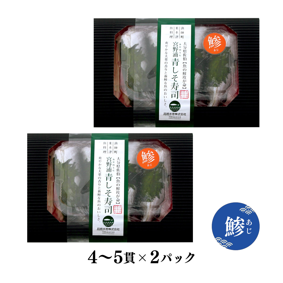 寿司 高橋水産 青しそ寿司 真あじ 4〜5貫×2パック 箱・保冷剤付 /海鮮 寿司 国産 大分県 冷凍 宮野浦 大葉 しそ 鮮魚 アジ