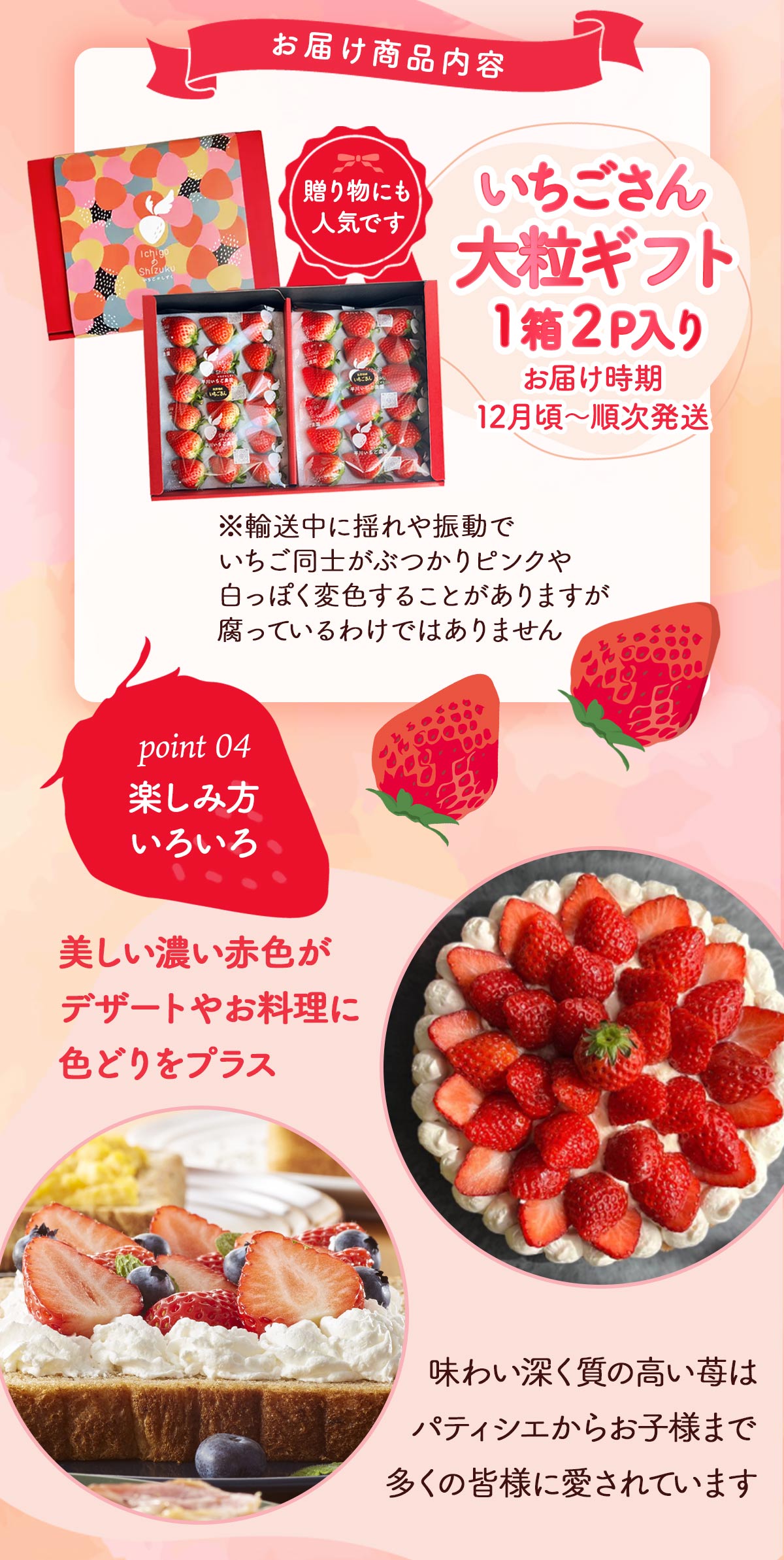 丁寧に育てられた苺は、パティシエからお子様まで幅広い方に愛される品質。