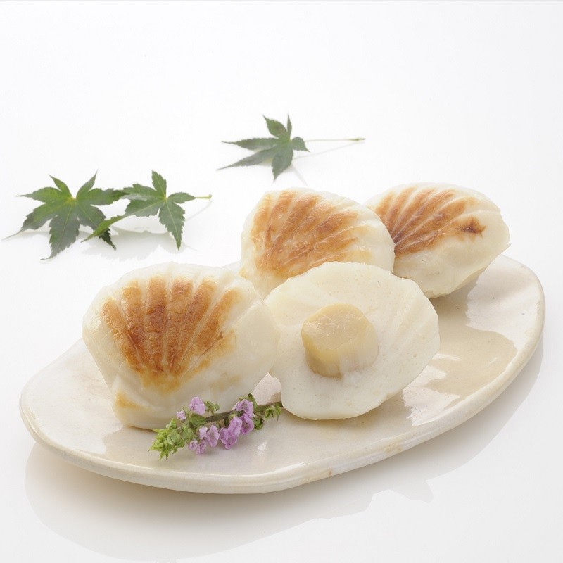 北海道近海産のすりみを使ったほたて型かまぼこの中に大粒の帆立貝柱がまるごと1個入っています。すり身にもホタテ貝柱のフレークを練り込み表面を軽く焼き付けて、香ばしく仕上げています。