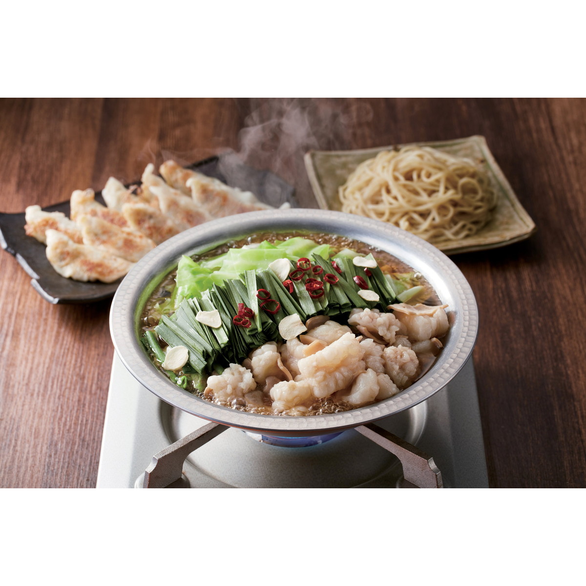 「和牛もつ鍋セット 1set/ギョウザ1」 燻製のスモーキーな香りと深い味わい、ぷりぷりの食感の和牛もつを醤油スープが引き締めるもつ鍋セット。ソフトでコシのある生麺ならではのちゃんぽんが締めの満足を引き立てます。黒豚餃子は焼いても、お鍋でも。