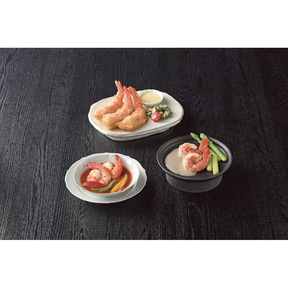 「足赤海老洋風料理」 強火でプリプリに仕上げたバター炒め、海老の味が引き立つブイヤベース、海老の旨みと食感が鮮度の良さを裏付ける海老フライです。