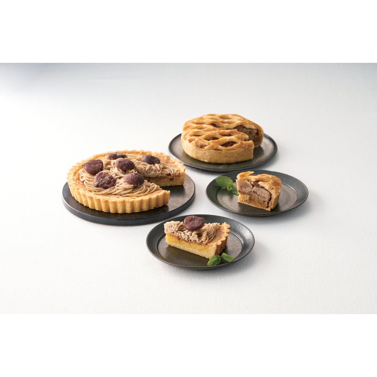 「モンブランパイ、タルトセット」 栗のペーストに渋皮栗を混ぜ合わせ焼き上げたパイと、口どけのよいマロンペーストをのせたタルトのセットです。