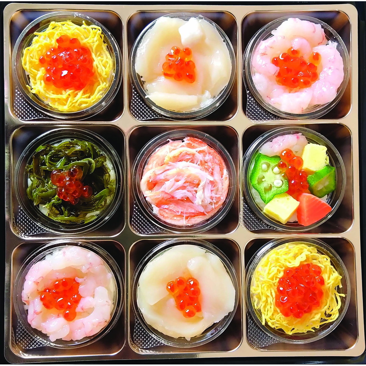 【数量・内容】プチいくら丼・プチ甘えび丼・プチほたて丼/各40g×2個、プチめかぶ丼・プチかに丼・プチ彩り丼/各40g