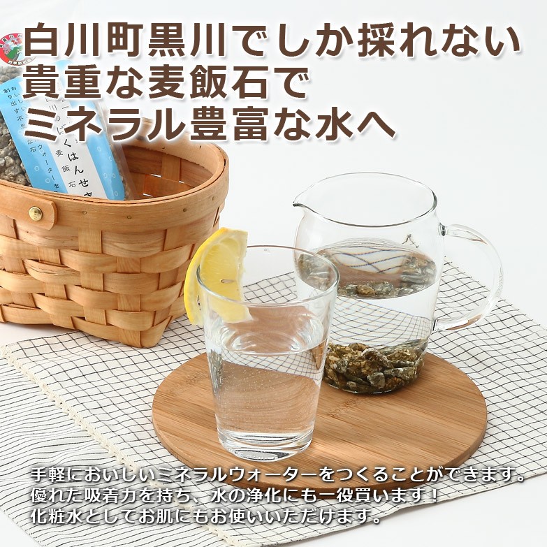 岐阜県白川町黒川が唯一の産地の「麦飯石」は、古来から漢方薬として用いられてきました。その薬性は甘く、毒なく各種皮膚病が治癒出来ると書かれています。カルシウム・鉄・ナトリウム・カリウムなど40種類以上のミネラルを水中に溶出し、手軽においしいミネラルウォーターをつくることができます。また、多孔性で表面積が大変よく、優れた吸着力を持ち、特に水中においてカルキや雑菌・汚染物質を吸着分解し水を浄化する働きに優れています。
