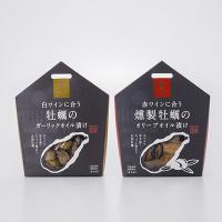 桜チップでじっくりと燻した香ばしい牡蠣を使った「赤ワインに合う燻製牡蠣のオリーブオイル漬け」、ガーリック、鷹の爪、黒胡椒入りの特製スパイスで味付けした「白ワインに合う牡蠣のガーリックオイル漬け」を詰め合わせました。