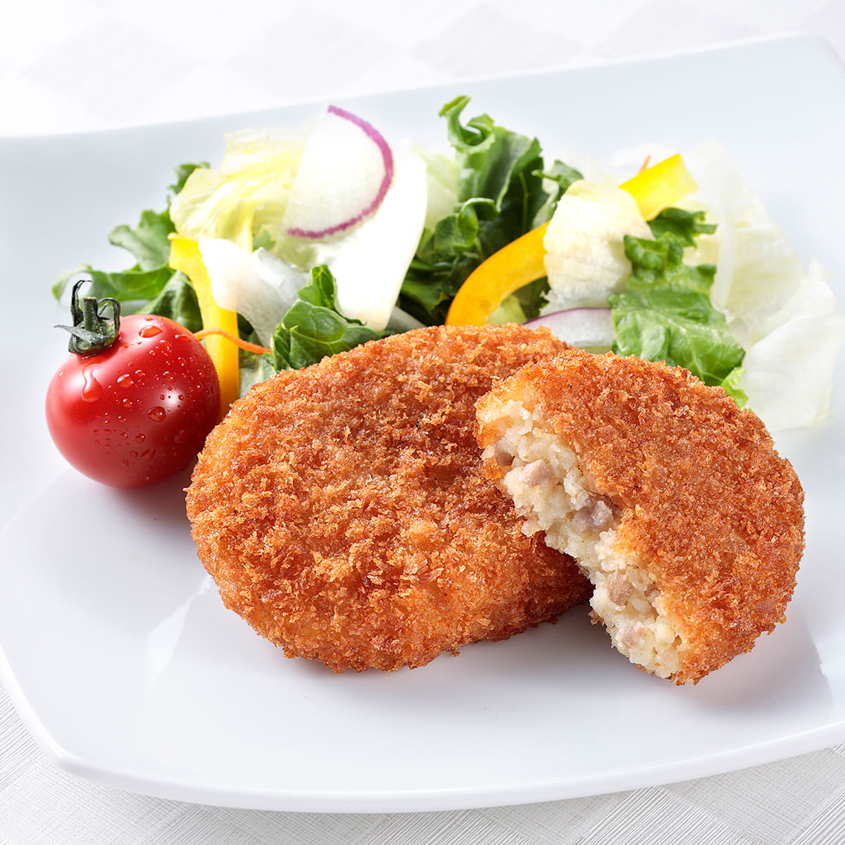 【原材料】野菜(ばれいしょ(国産)、たまねぎ)、豚肉、小麦粉加工品、砂糖、牛脂、植物油脂、食塩、ゼラチン、粒状植物性たん白、香辛料、衣(パン粉、でん粉、小麦粉、粉末状植物性たん白、植物油脂、大豆粉、脱脂粉乳、卵黄粉)、揚げ油(大豆油)/トレハロース、乳化剤、増粘剤(グァー)、着色料(ココア)、(一部に小麦・卵・乳成分・牛肉・ゼラチン・大豆・豚肉を含む)