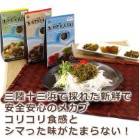 【三陸十三浜で採れた新鮮で安全安心のメカブコリコリ食感とシマった味がたまらない!】宮城県石巻市北上町で、「わかめ」海藻食品を製造加工販売をして30年、三陸十三浜の新鮮で安全安心の旨い海藻食品を全国におとどけしている「タツミ食品」からメカブの甘酢漬け3種の詰め合わせです。石巻市北上町十三浜は親潮と黒潮がぶつかる南三陸沿岸地域のひとつで奥羽山脈を背景に東北最大の河川、北上川河口に位置する漁村です。豊富なミネラルに恵まれ、古くから「わかめ」を中心に、美味しい海藻が獲れる地域です。ここで育まれた「メカブ」を生のまま甘酢に漬けた商品です。和え物、サラダ、カルパッチョに添えて・・・色々とお試しください。