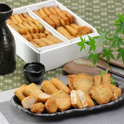 【原材料】魚肉(タラ・とび魚・その他)、さつまいも澱粉、トレハロース、粗糖、上白糖、天日塩、地酒、みりん、卵白、植物油、保存料(しらこたんぱく)、調味料(アミノ酸等)、人参、ごぼう、ニラ、えび、さつまいも、玉ねぎ、こしょう、しょうが、豆腐
