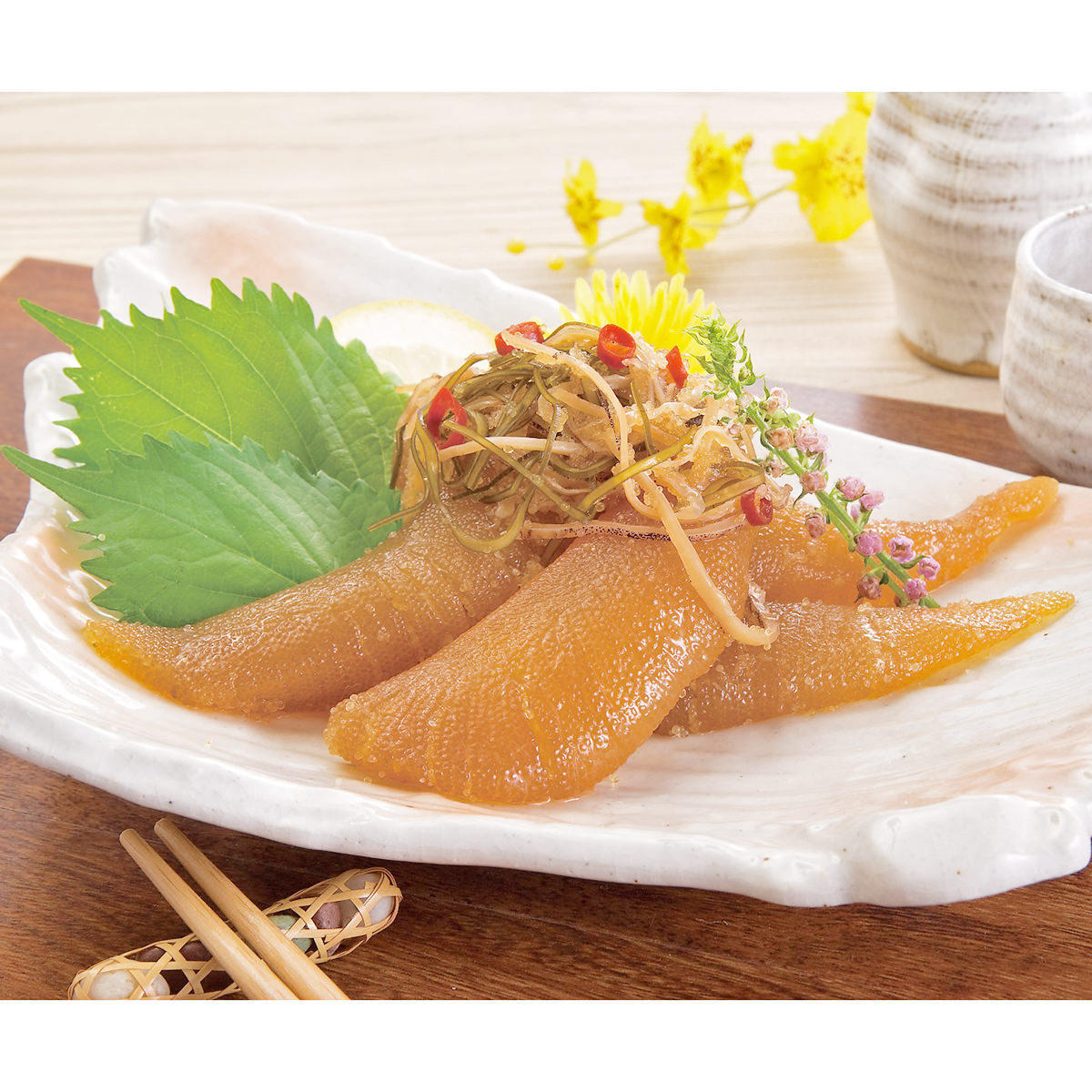 【原材料】数の子(ドイツ産)、しょうゆ(小麦・大豆を含む)、砂糖、みりん、スルメイカ、昆布、食塩、還元水あめ、たん白加水分解物、赤唐辛子、かつお節粉末、酵母エキス、かつおエキス/ソルビット、調味料(アミノ酸等)、酒精、増粘多糖類