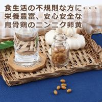 【食生活の不規則な方に・・・栄養豊富、安心安全な烏骨鶏のニンニク卵黄】南九州に古くから伝わるニンニク卵黄を、原料にこだわり、丁寧に仕上げました。有機にんにくと烏骨鶏の卵黄はすべて自社農場で栽培、飼育しています。2000坪の農場で太陽と大地のめぐみを充分に吸収してのびのびと自然に卵を産みます。そんな恵まれた環境と自家配合の飼料で育てられた烏骨鶏のニンニク卵黄は、自信を持ってお届けする逸品です。本品は、胃の弱い方や、匂い戻りの気になる方のために烏骨鶏のニンニク卵黄を、腸で溶けるソフトカプセルに充填しました。日々の健康管理に、是非一度お試しください。