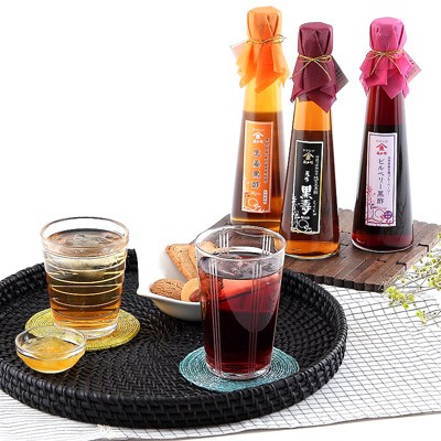 福山酢は鹿児島県福山町で、二百年の伝統を誇る壺仕込み黒酢の醸造元の黒酢を3本セットでお届けします。【黒寿】露天かめ壷にて二年以上もの年月をかけ発酵熟成させた、福山酢の最高級純玄米黒酢です。まろやかで深みのある風味豊かな仕上がりです。【ビルベリー黒酢】二年熟成黒酢「黒寿」に北欧産野生種のビルベリー濃縮果汁 (アントシアニンが豊富で目に優しいと言われています)と オリゴ糖を加えました。【生姜黒酢】二年熟成黒酢「黒寿」に鹿児島県大隅産「黄金生姜」、オリゴ糖を バランス良く配合されています。
