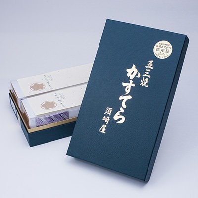 素材にこだわり、熟練の職人の技と心を全て投入して、一枚ずつ丹念に手焼きして仕上げている須崎屋の「特選五三焼カステラ2本入」。