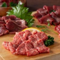 【数量・内容】メン(三枚バラ)80g×1、大トロ80g×1、たたき80g×1、上赤身80g×1、ユッケ50g×1、馬刺しのたれ5ml×6、しょうが3g×6、たたきのたれ20g×1、ユッケのたれ10g×1