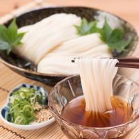 小豆島に手延素麺の製法が伝わったのは、約400年前といわれています。以来、瀬戸内の澄んだ空気と、良質の水、気候風土が麺造りに大変適している事もあり、小豆島の手延べそうめんは、三輪・播州と並ぶ日本三大素麺の一つとなりました。小豆島の手延べそうめんの特徴は、製麺時に小豆島の名産品である「胡麻油」を練り込むことで、他のそうめんとは違った風味を味わっていただけます。冷たいままつゆにつけて味わっていただくと麺の美味しさがよく分かります。細麺ながらにコシのある麺、そしてモチモチつるつるした食感は、食欲のない時もペロッと食べられます。
