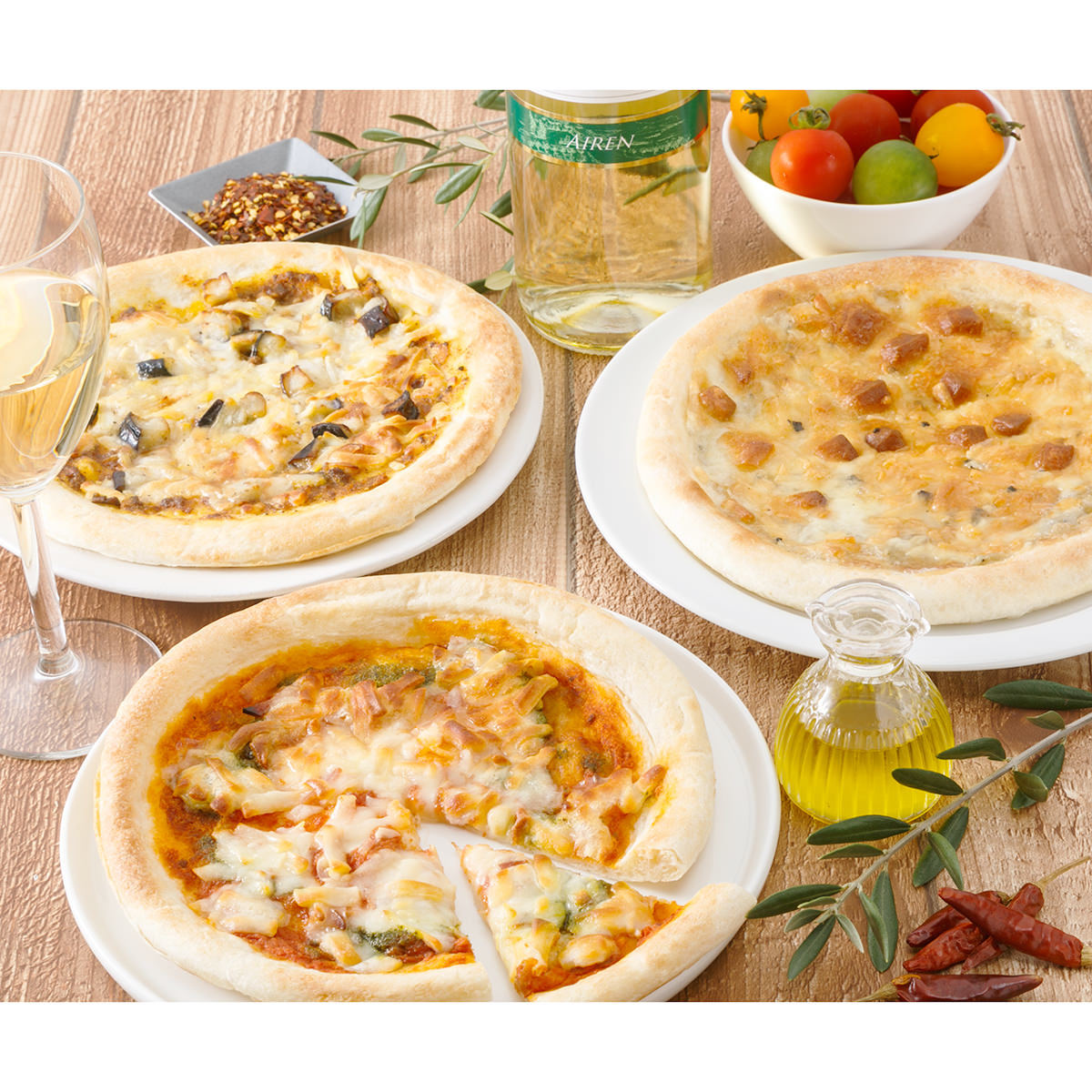 【原材料】【黒トリュフと4種のチーズのピッツァ】クラスト(小麦(国内製造)、食塩、糖類(麦芽糖、ぶどう糖)、イースト、粉末デュラム小麦サワー種)、ナチュラルチーズ、牛乳、なたね油、バター、トリュフ(中国)、小麦粉、食塩、香辛料/セルロース、増粘剤(加工デンプン)、香料、(一部に小麦・乳成分を含む)【ボロネーゼのピッツァ】クラスト(小麦(国内製造)、食塩、糖類(麦芽糖、ぶどう糖)、イースト、粉末デュラム小麦サワー種)、ナチュラルチーズ、揚げなす、粗ごしトマト、トマト・ジュースづけ、牛肉、ソテードオニオン、ワインエキス、にんじん、トマトペースト、食物油脂(大豆油・オリーブ油)、食塩、ガーリック、香辛料、ビーフエキス調味料、砂糖/セルロース、増粘剤(加工デンプン)、調味料(アミノ酸等)、カラメル色素、(一部に小麦・乳成分・牛肉を含む)【ピッツァマルゲリータ】クラスト(小麦(国内製造)、食塩、糖類(麦芽糖、ぶどう糖)、イースト、粉末デュラム小麦サワー種)、ナチュラルチーズ、粗ごしトマト、ベーコン、バジルペースト、なたね油、食塩/セルロース、増粘剤(加工デンプン)、リン酸塩(Na)、調味料(アミノ酸)、酸化防止剤(V.C)、発色剤(亜硝酸Na)、(一部に小麦・乳成分・豚肉を含む)