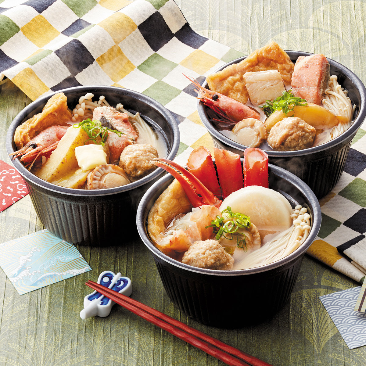 【原材料】【塩味】いももち(じゃがいも(国産)、砂糖、食塩)、ベニズワイガニ(北海道)、えのきたけ(国産)、肉だんご(鶏肉(国産)、つなぎ(パン粉、でん粉、粉末状大豆たん白)、粒状大豆たん白、たまねぎ、食塩、砂糖、香辛料、粉末水あめ)、たれ(食塩、醤油、砂糖、米発酵調味料、蛋白加水分解物、昆布エキス、魚醤、ガーリックパウダー)、ホタテガイ(北海道)、油揚げ(大豆、植物油)、ゼラチン/凝固剤、加工でん粉、グルコマンナン、調味料(アミノ酸等)、リン酸塩(Na、K)、酸味料、(一部に小麦・乳成分・えび・かに・大豆・鶏肉・ゼラチンを含む)【醤油味】えのきたけ(国産)、スケトウダラ(北海道)、ギンザケ(チリ)、揚げジャガイモ(ばれいしょ(北海道)、パーム油)、たれ(しょうゆ、米発酵調味料、食塩、砂糖、チキンガラスープ、水飴、みりん、清酒、たんぱく加水分解物、ビーフエキス)、肉だんご(鶏肉(国産))、つなぎ(パン粉、でん粉、粉末状大豆たん白)、粒状大豆たん白、たまねぎ、食塩、砂糖、香辛料、粉末水あめ)、ホタテガイ(北海道)、ボイル海老(甘えび(カナダ)、食塩)、油揚げ(大豆、植物油)、ゼラチン/凝固剤、調味料(アミノ酸等)、リン酸塩(Na、K)、調味料、(一部に小麦・乳成分・えび・さけ・大豆・鶏肉・牛肉・ゼラチンを含む)【みそ味】白鮭(北海道)、揚げジャガイモ(ばれいしょ(北海道)、パーム油)、えのきたけ(国産)、肉だんご(鶏肉(国産))、つなぎ(パン粉、でん粉、粉末状大豆たん白)、粒状大豆たん白、たまねぎ、食塩、砂糖、香辛料、粉末水あめ)、たれ(味噌、食塩、ごま、砂糖、ポークエキス、小麦粉、ビーフエキス、チキンエキス、酵母エキス)、ホタテガイ(北海道)、ボイル海老(甘えび(カナダ)、食塩)、油揚げ(大豆、植物油)、バター(生乳、食塩)、ゼラチン/凝固剤、調味料(アミノ酸等)、酒精、増粘剤(キサンタン)、リン酸塩(Na、K)、酸味料、(一部に小麦・乳成分・えび・さけ・大豆・豚肉・牛肉・鶏肉・りんご・ごま・ゼラチンを含む)