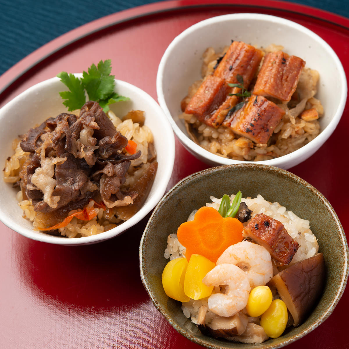 「松阪牛おこわ」は、日本三大和牛の一つである松阪牛を贅沢に使い、ゴボウ、にんじん、生姜で甘辛く炊き合わせました。こだわりの木の蒸籠でじっくりと蒸し上げてるので松阪牛の上品な甘みとコクがギュッと凝縮されています。「吹き寄せおこわ」は、干しエビ、シイタケで味付けしたおこわに栗、銀杏、海老などの色とりどりの食材を添え、見た目も楽しんでいただくことができ、おもてなし料理としても便利です。「穴子おこわ」は、特製ダレをつけてカリッと香ばしく焼き上げ、ふっくらと蒸し上げた国産穴子をのせてます。穴子のたれと山椒の組合せが絶妙です。
