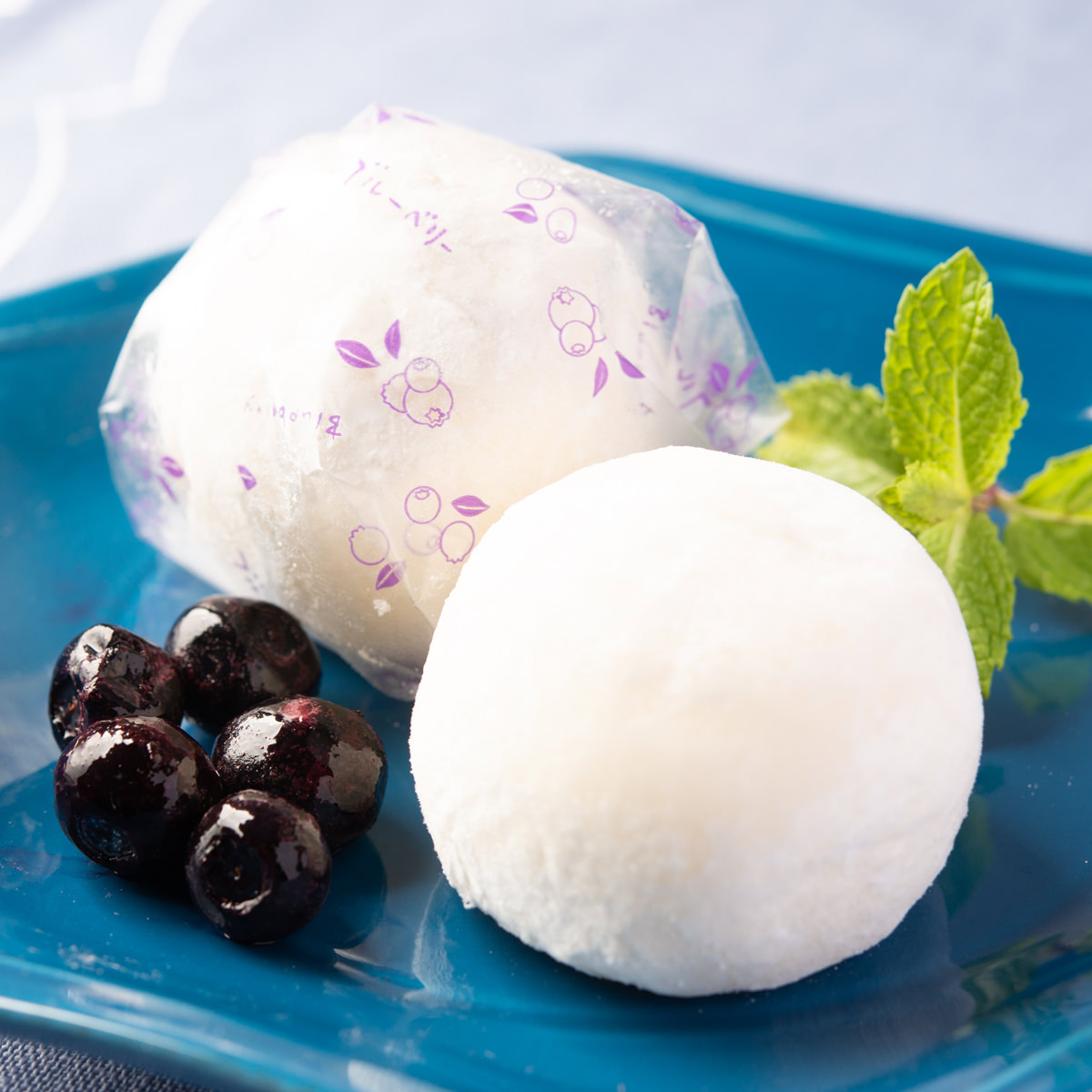 ブルーベリー果実と、ふわふわの濃厚生クリームを、もちもち食感のお餅で包み込みました。