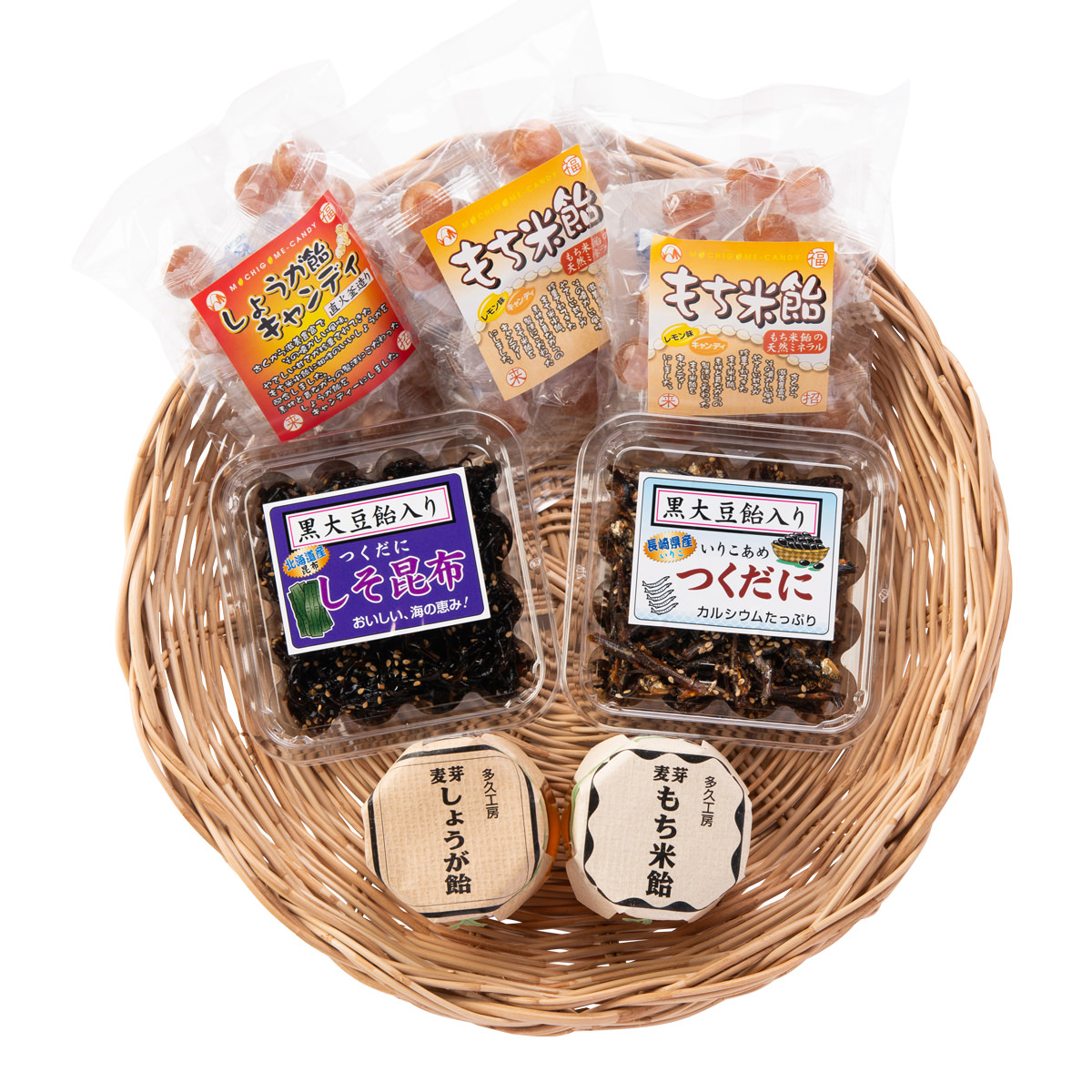【数量・内容】もち米飴(200g)、しょうが飴(200g)、いりこ佃煮(120g)、しそ昆布佃煮(120g)、もち米飴レモンキャンディー(90g×2)、しょうが飴キャンディー(90g×2)