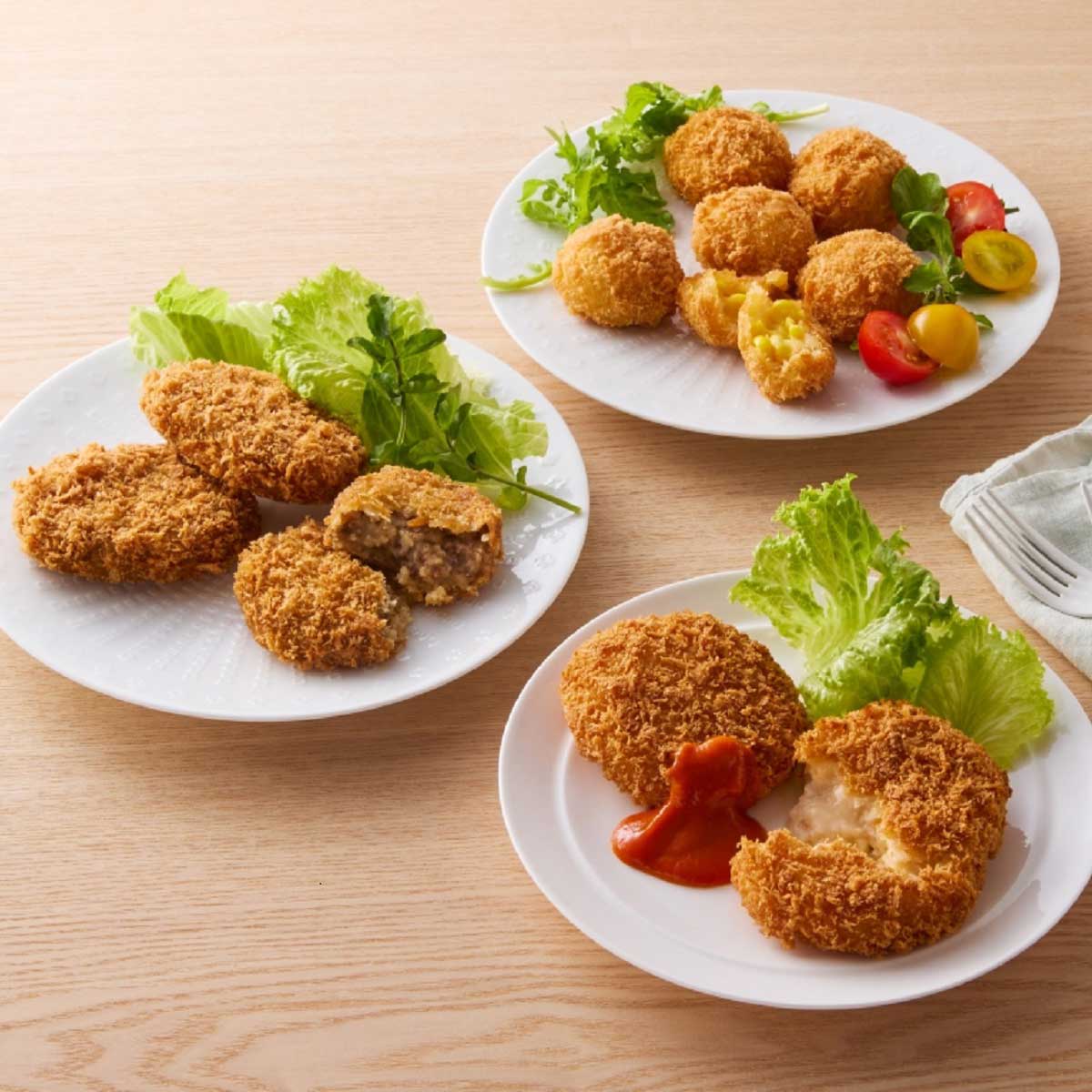 とうもろこしの自然な甘みを味わうプチコロッケ、蟹の美味しさをギュッと濃縮したクリームコロッケ、牛肉の旨みがあふれるコロッケの3種セットです。