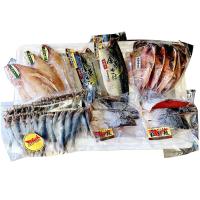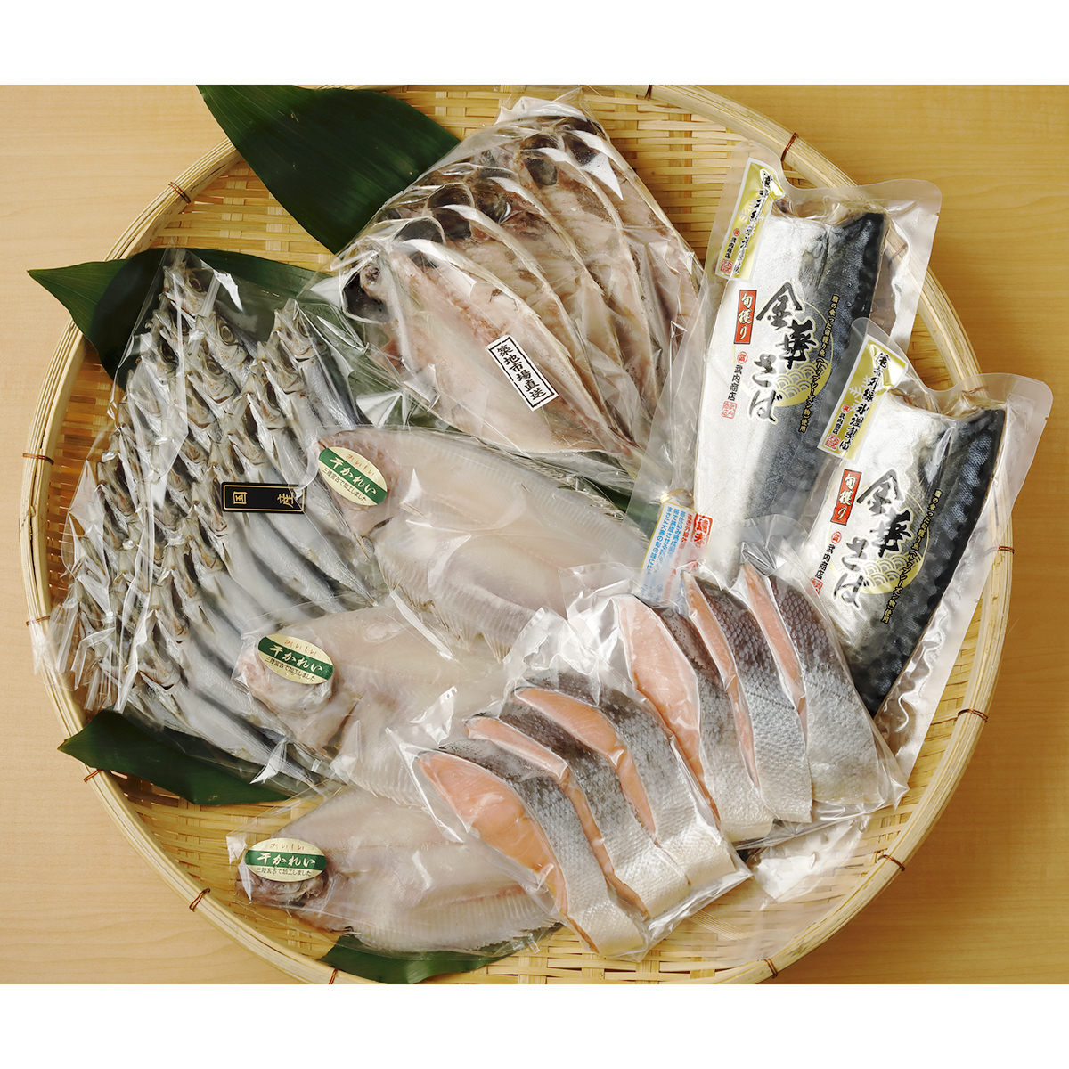 【数量・内容】村上塩引鮭×6(400g)、アジ開干し×5(500g)、干カレイ×3(600g)、さば干物×2(200g)、ウルメ丸干し1連×3(300g)