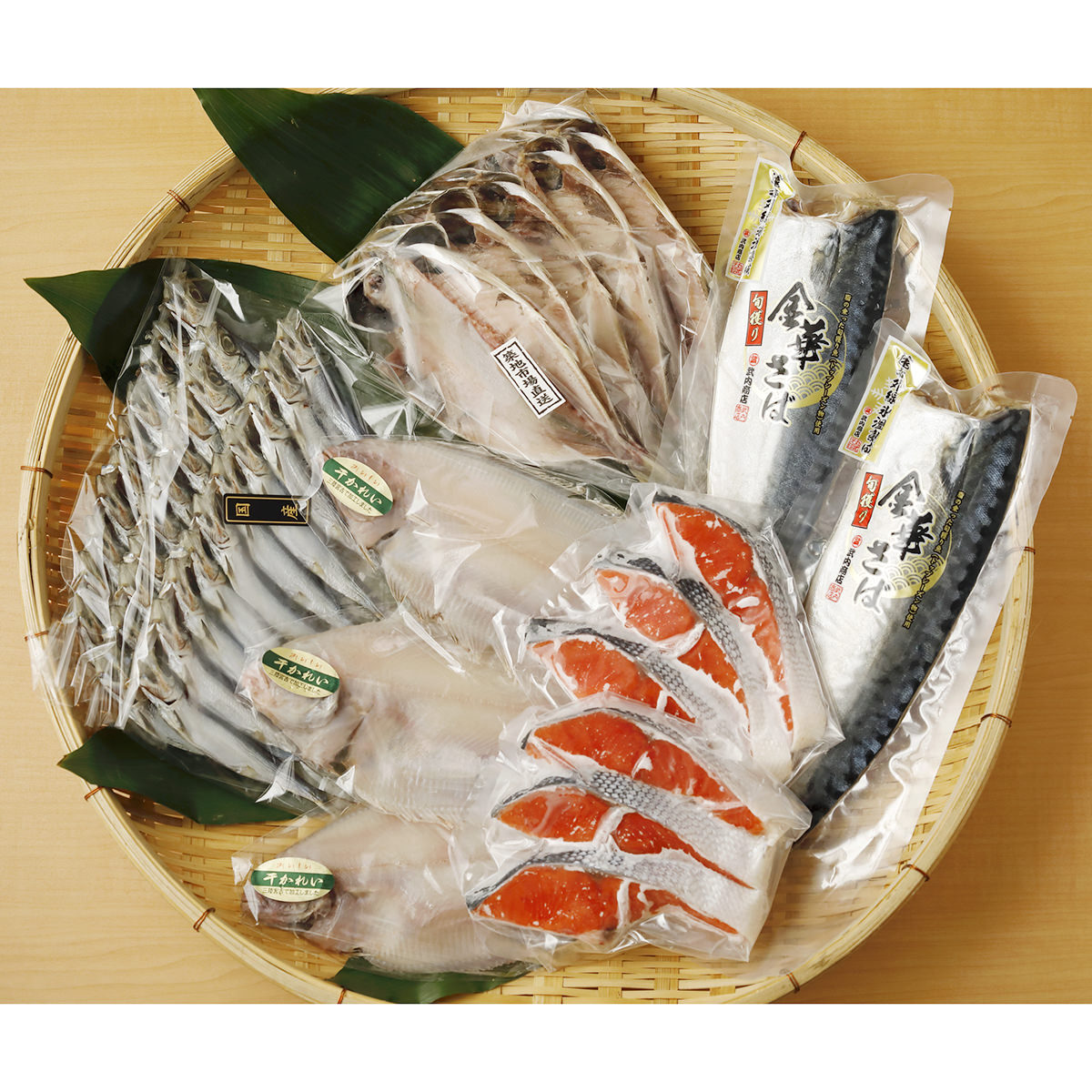 【数量・内容】紅鮭×6(400g)、アジ開干し×5(500g)、干カレイ×3(600g)、さば干物×2(200g)、ウルメ丸干し1連×3(300g)
