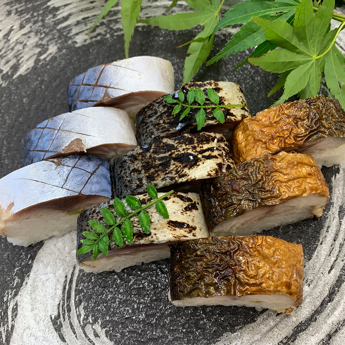 【数量・内容】わさび梅酢しめ鯖棒寿司、わさび焼き鯖棒寿司、わさび梅酢炙り鯖棒寿司 各8切れ