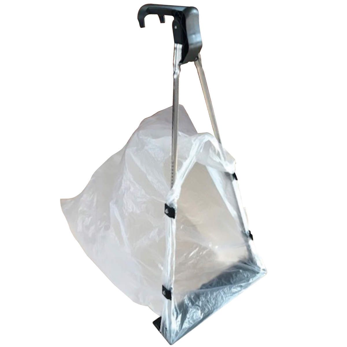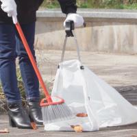 袋取り付け型ちりとり 「ふくろうちりとり」です。ゴミ袋をちりとりに変身させる、現場や家庭でも便利なアイデアツールです。お庭の掃除に、企業や地域の清掃活動に、仕事現場の後片付けにお使いいただけます。市販の45Lのゴミ袋をセットするだけで、ちりとりに変身。ゴミがたまれば、袋を閉じてそのままゴミ出し完了です。コンパクトに折りたたみできるので、収納場所にも困りません。フレームは丈夫でさびにくいステンレススチール製です。