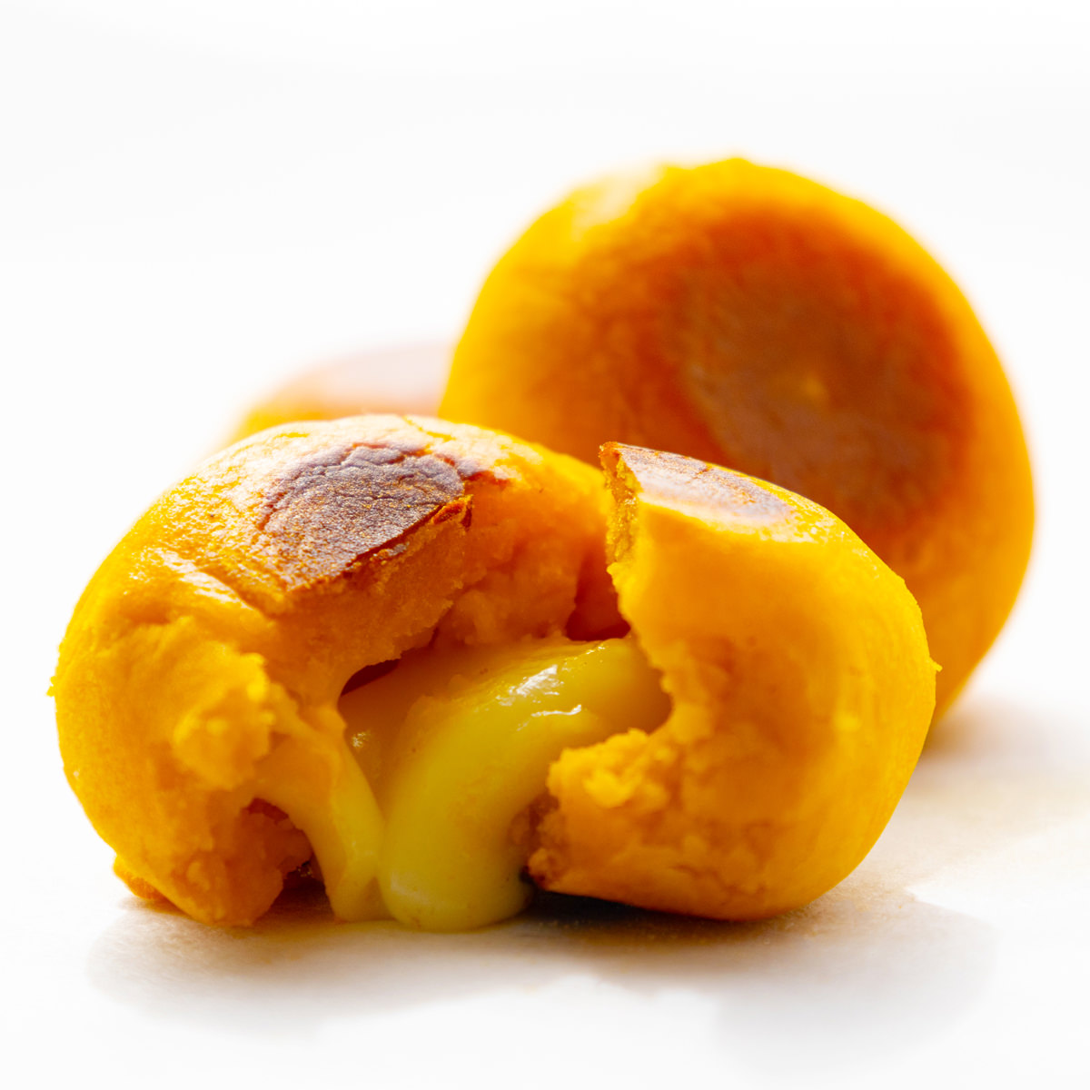 「かぼちゃ団子」は、北海道・苫前町の上田ファームが独自の製法で仕上げたかぼちゃのおだんごです。愛情込めて大切に育て上げたかぼちゃを、ファーム内の加工場でホクホクのかぼちゃ団子に仕上げました。あらかじめ加熱してあるので冷凍のまま加熱調理が可能です。揚げ油で揚げたり、汁物などに入れて煮込んだり、焼いてそのまま食べても美味しくお召し上がりいただけます。おやつに、おつまみに、かぼちゃ団子をお楽しみください。北海道の郷土料理「かぼちゃ団子」。団子の中から溢れるチーズが嬉しい「チーズin」をお楽しみください。