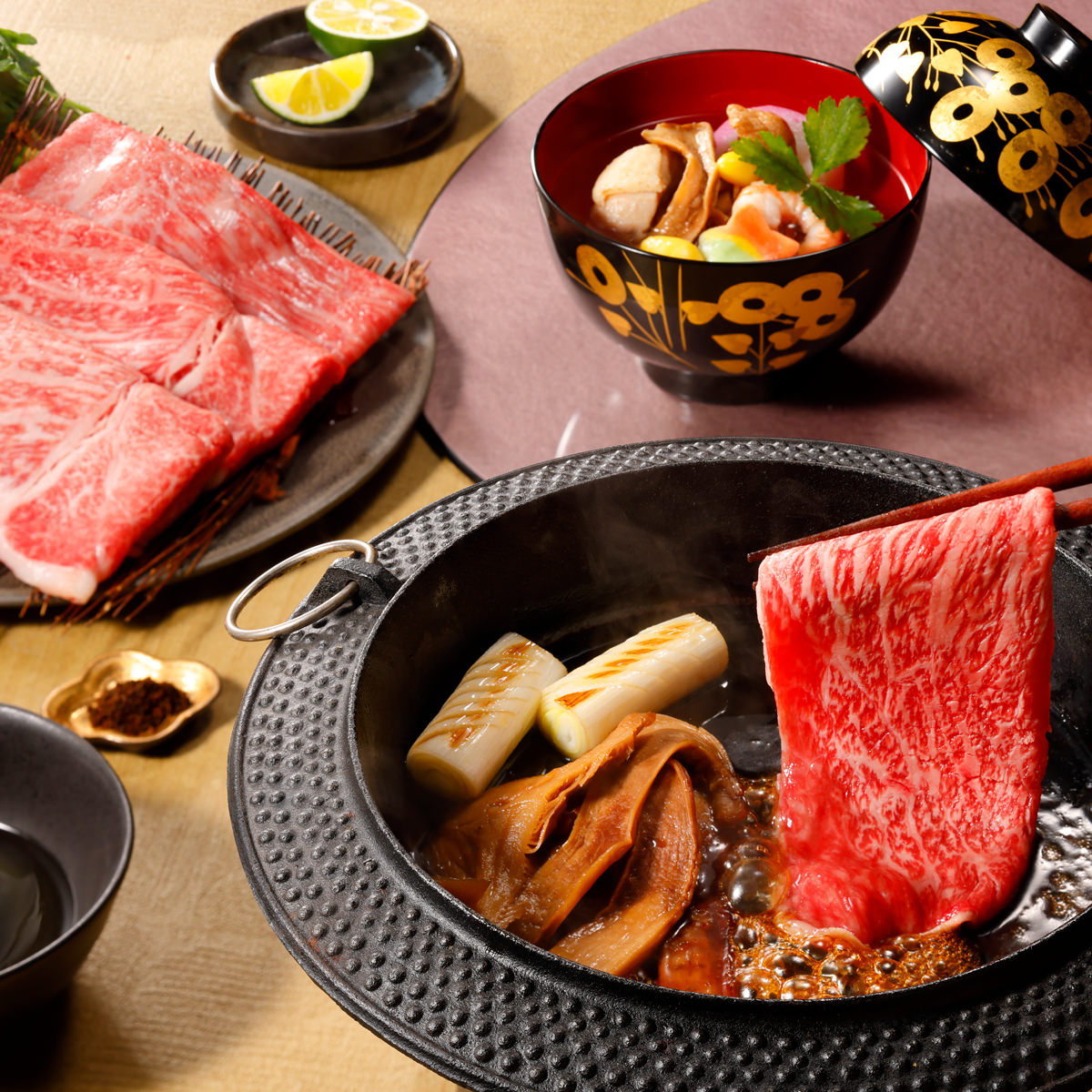 <すき焼き>和牛ならではの上質な脂の甘みと甘めの割り下が浸みた芳醇な松茸のハーモニーをご堪能いただけます。溶き卵と一緒に、京都の祇園 原了郭(ぎおん はらりょうかく)の黒七味を是非お使いください。上品な香りとアクセントが効いた格別な松茸すき焼きをお愉しみいただけます。京風すき焼き割り下と牛脂も付属します。