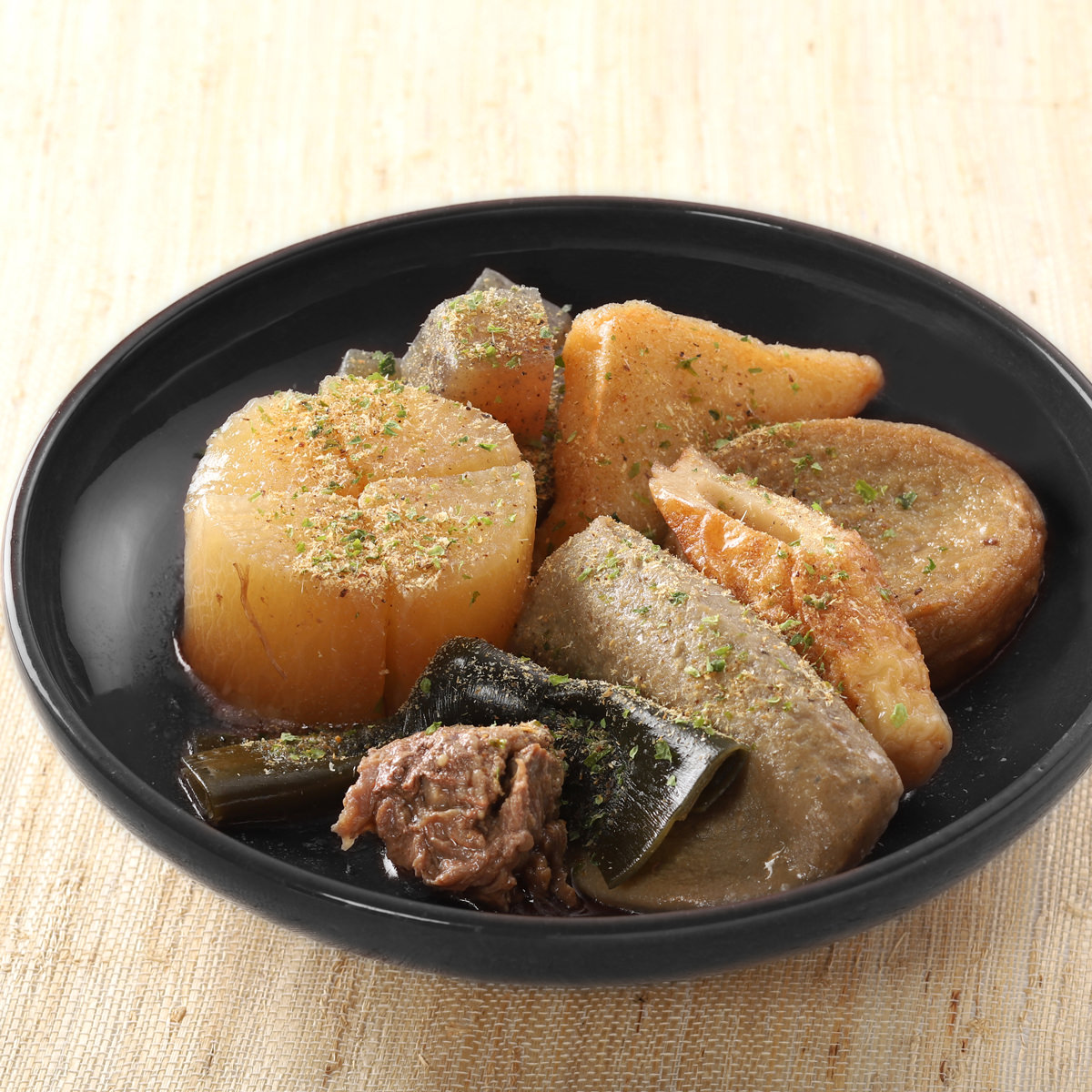 【原材料】具(大根(国産)、黒はんぺん、ちくわ、さつま揚げ2種、こんにゃく、牛肉、結び昆布)、出汁(醤油(国内製造)、鰹節だし、昆布だし、粗糖、鰹節エキス、昆布エキス、しいたけエキス)、だし粉(さば節、イワシ、煮干し、あおさ)/水酸化Ca(こんにゃく凝固剤)、(一部に小麦・卵・さば・大豆・牛肉を含む)